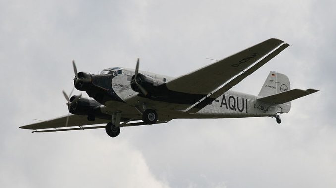 Tintin had started his adventures in the Eastern Europe in “Tintin in the Land of the Soviets”, after travelling through Africa, North and South America, Brirain and the Orient he returned to East Europe in “King Ottokar’s Sceptre”. He had to travel to Klow, the capital of the imaginary kingdom of Syldavia with Professor Alembick. The first leg of the journey took him to Prague. This journey was conducted in a yellow tri-engine passenger aircraft. The aircraft shown in the book resembles closely the Junker Ju 52 which was a popular passenger airliner from the 1930s till the late forties. The physical shape of the aircraft and the engines match the Ju 52. Also, the internal seating arrangement and the seat shape drawn by Herge match those on the Ju 52. This book was published in 1939, so it matches the period also.